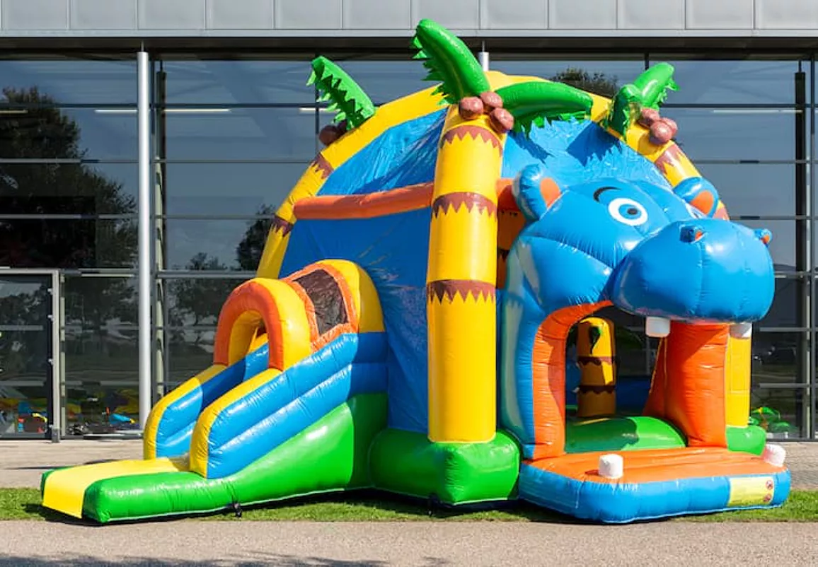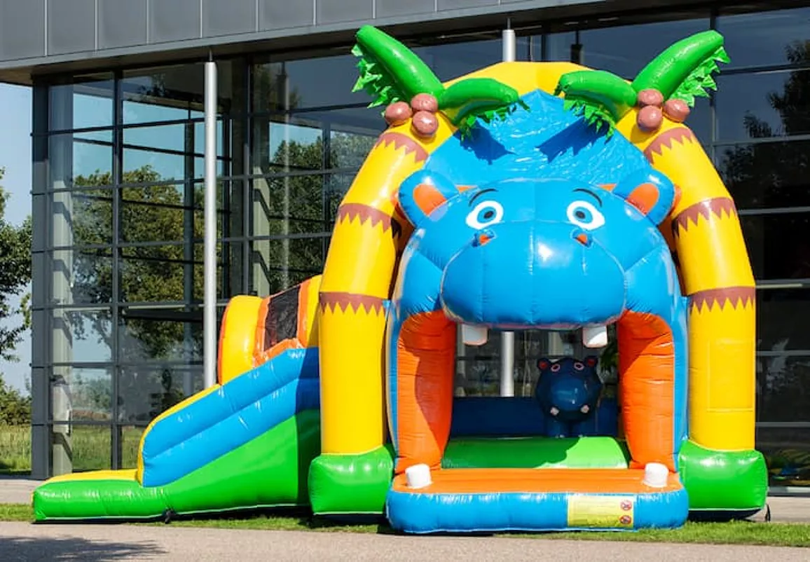 Nadat de kinderen eerst flink gesprongen hebben op het overdekte springkussen en met de 3D objecten gespeeld hebben, glijden ze via de glijbaan aan de zijkant weer naar buiten. En dit keer op keer opnieuw, kinderen kunnen er geen genoeg van krijgen. De felle kleuren en leuke 3D figuren in nijlpaard thema maken er een helemaal een feest van.